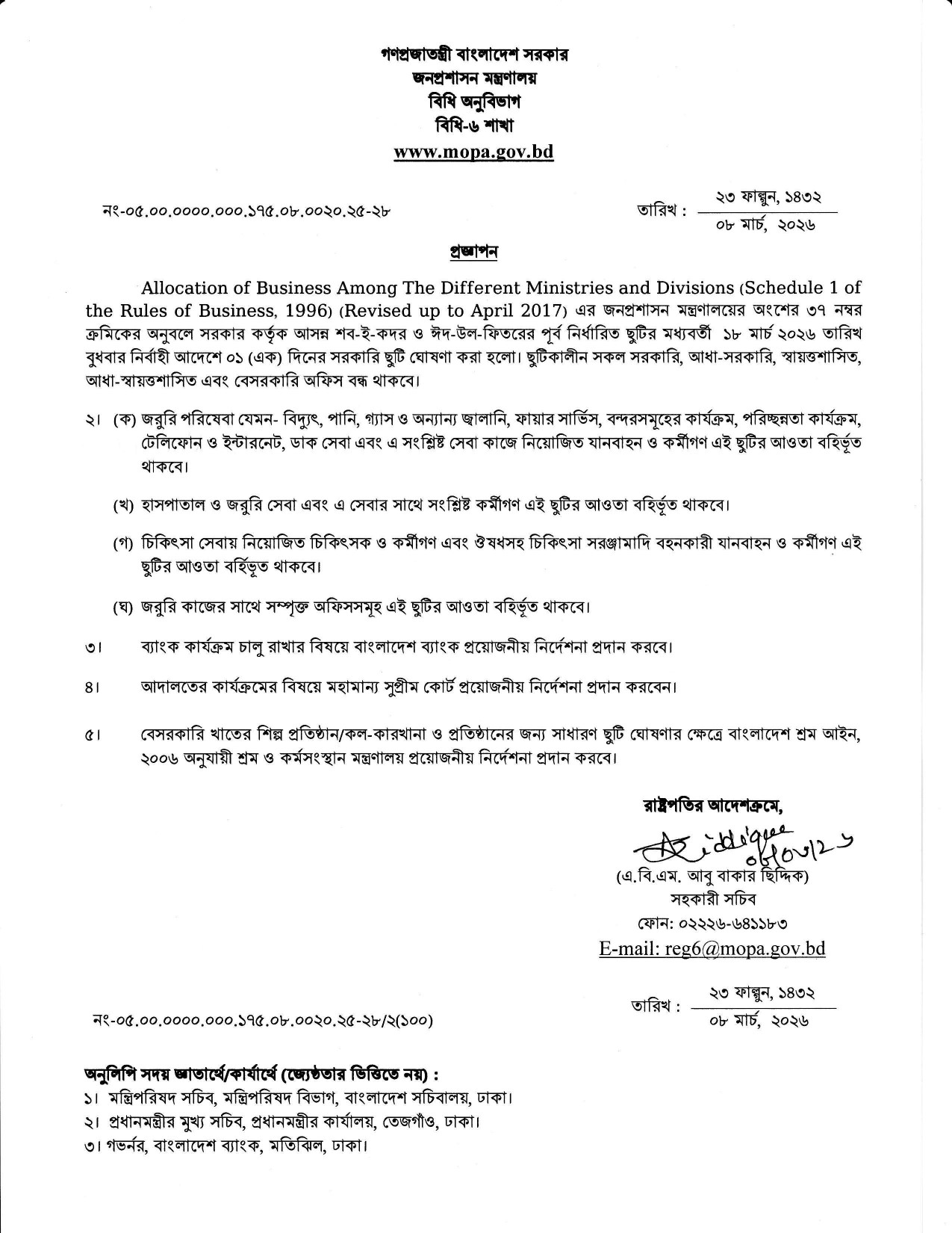 আসন্ন পবিত্র ঈদ-উল-ফিতর উপলক্ষ্যে ১৮ মার্চ ২০২৬ তারিখ বুধবার নির্বাহী আদেশে সরকারি ছুটি ঘোষণা।